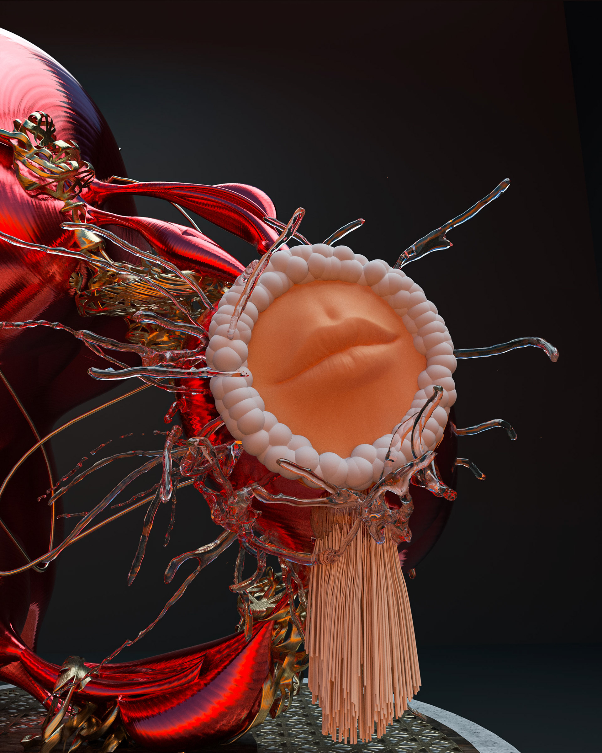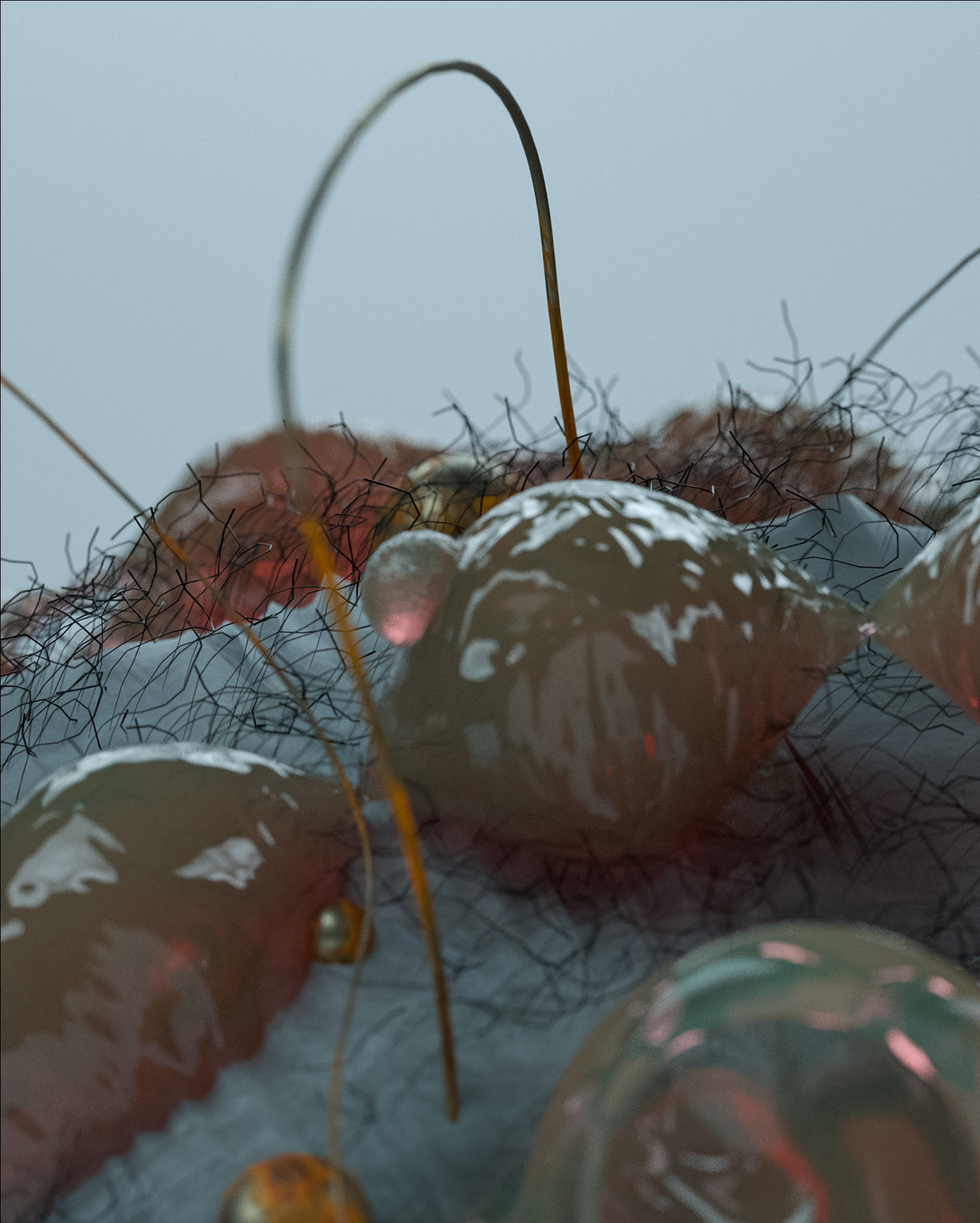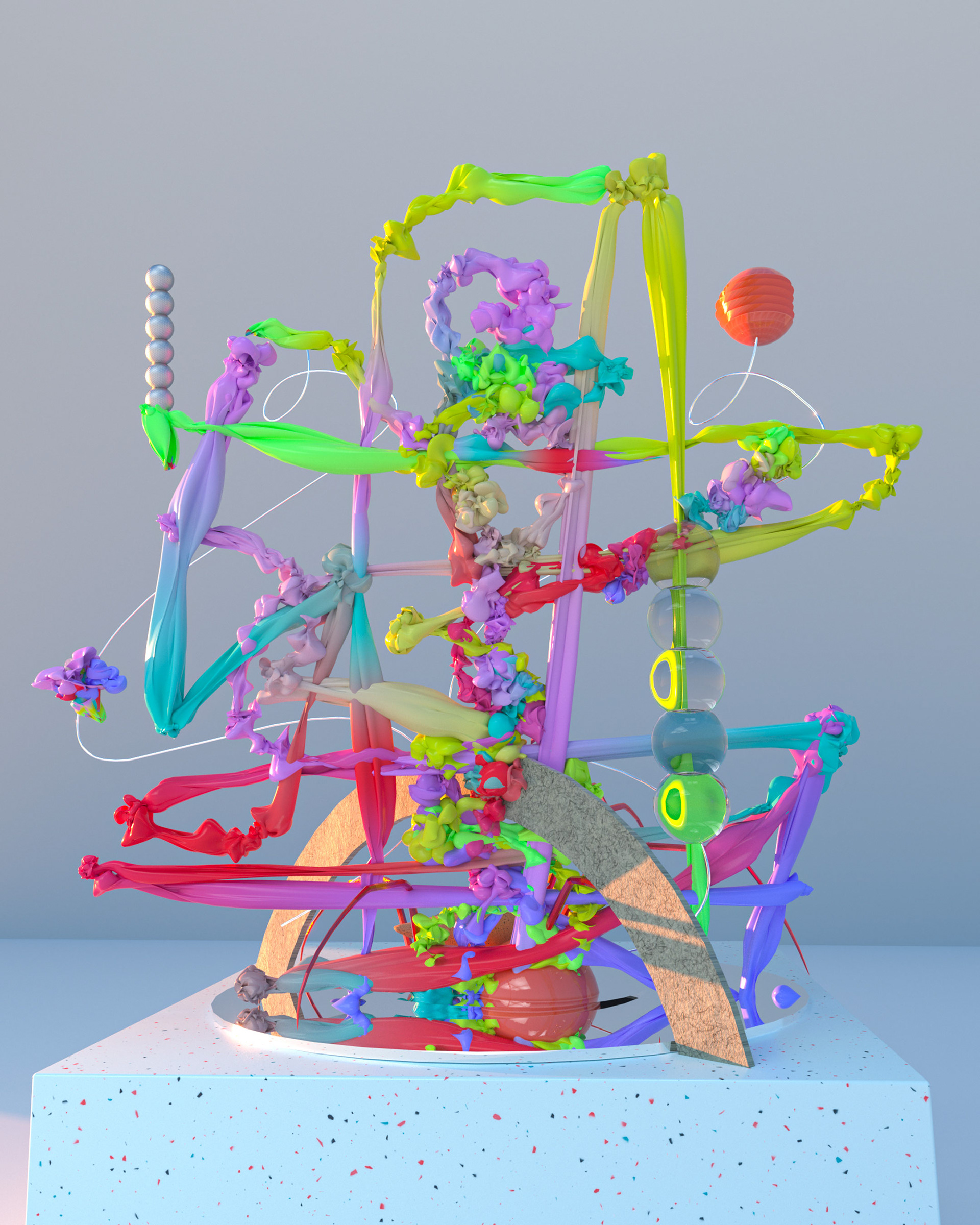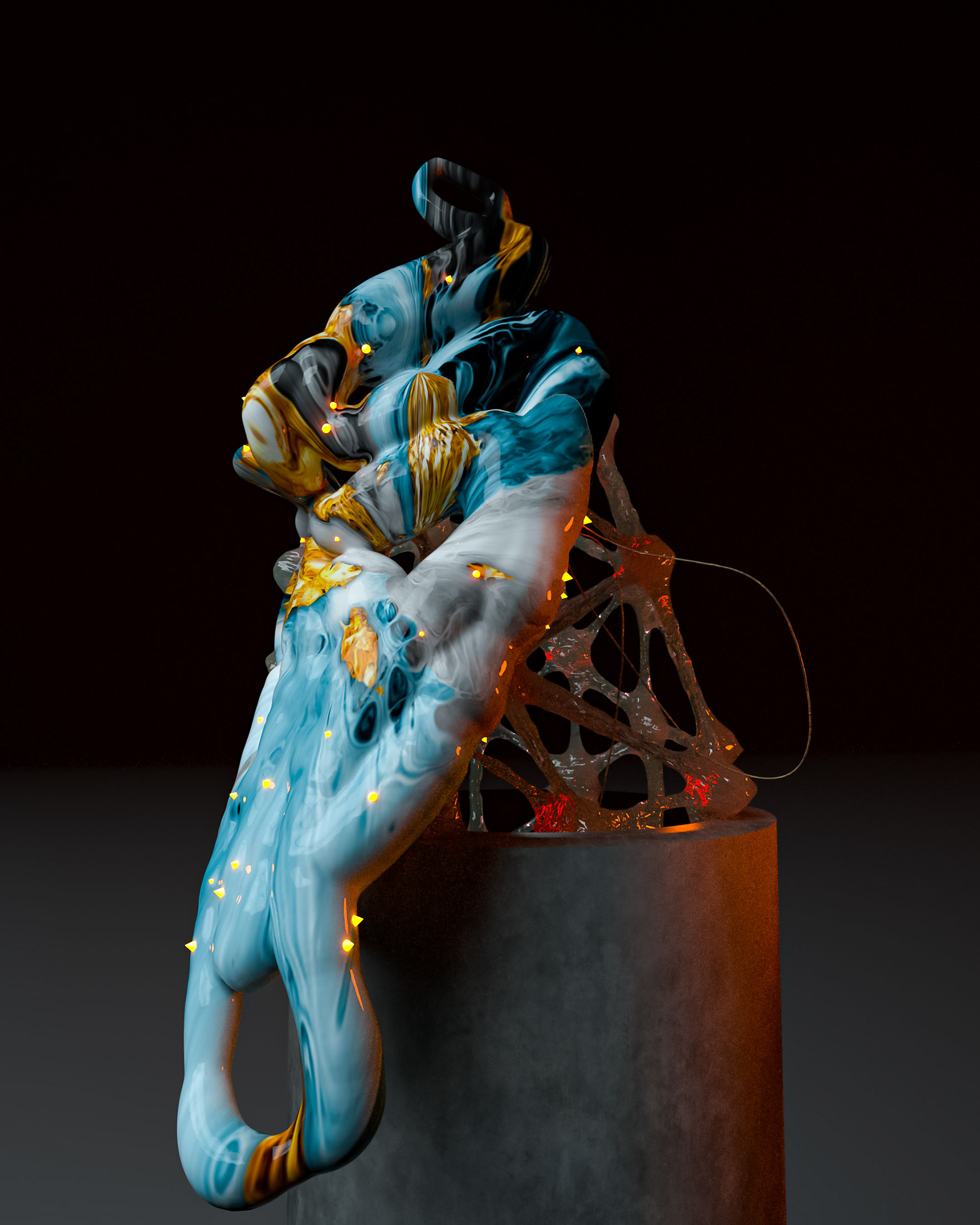 A collection of sculptures featuring juxtaposed organic and synthetic materials created with Cinema 4D and Octane render.